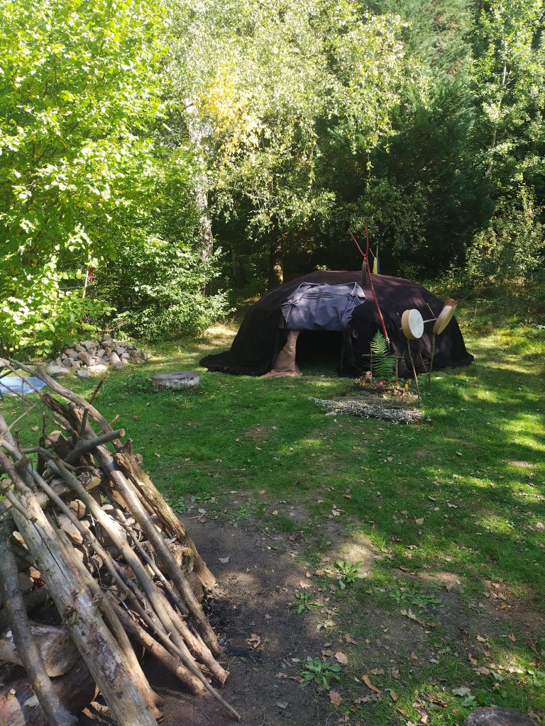 Die Schwitzhütte ist ein runder, geschlossener Raum aus Weidenstecken und dient als Ort der rituellen Reinigung, Erneuerung und Wiedergeburt.
